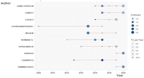 On the other hand, Figure 5 displays the production over the time of the top-10 most productive authors. In this case, Löfgren-Mårtenson is the researcher that has published more documents about the subject throughout the years. The first article was released in 2008 and the last one in 2017 (with the highest number of publications in 2015). This author is followed by Chadwick (2013–2019), Normand (2012–2017), and Shpigelman (2014–2019). Currently, Ågren, Hemmingsson, Chiner, Gómez-Puerta, Caton, and Shpigelman are the most productive authors in the field (years 2019–2020).