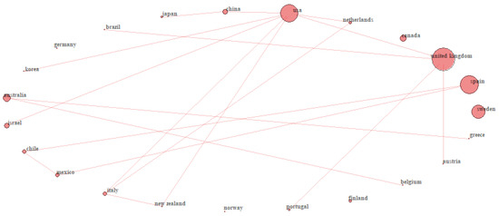 Finally, collaboration networks among countries and among institutions were examined. As displayed in Figure 6, USA, United Kingdom, Spain, and Australia are the ones with more research collaborations related to the subject of study. Specifically, the USA has collaborated with European (United Kingdom, Netherlands, and Italy) and Asian (China, Korea, Israel) countries as well as with New Zealand. On the other hand, the United Kingdom has collaborated with Austria, Portugal and Brazil, while Spain has mainly collaborated with Spanish-speaking countries such as Chile and Mexico. Finally, Australian collaboration was with two European countries, Belgium and Greece.