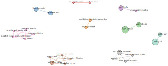At an institutional level, six collaboration networks stand out with two affiliations per network and three networks that counted on the collaboration of four or five affiliations (Figure 7). In general, affiliation collaboration networks are among institutions from the same country, either for networks with only two affiliations (e.g., Sweden: Malmö University and University West; Spain: University of Valencia and University of Alicante; Israel: University of Haifa and The Hebrew University of Jerusalem) or for networks with more than two affiliations like in Canada. In this country we find collaborations, on one hand, among francophone affiliations (Université du Québec à Trois-Rivières, Université du Québec en Outaouais, Université du Québec à Montréal, and Institut universitaire en DI et TSA), and, on the other hand, among English-speaking affiliations (University of Toronto, Campbell Family Mental Health Research Institute, University Health Network, Toronto, and Centre for Addiction and Mental Health, Toronto).