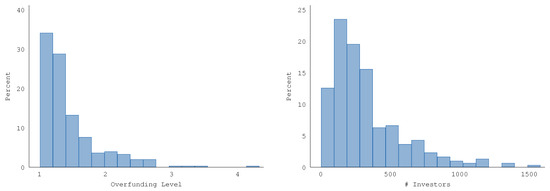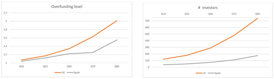 On average, the overfunding levels found in previous studies are very close to our figure of 1.45 for the whole sample: in reward-based crowdfunding, Mollick [8] found that funded projects on Kickstarter achieve 1.5 times their goal, and in equity crowdfunding Vulkan et al. [9] found 1.38 in projects launched on SEEDRS. However, the average number of investors per campaign differs considerably. On average, we obtain 324 investors in our whole Crowdcube sample, while Mollick [8] and Vulkan et al. [9] find 122 and 158 investors, respectively, for funded projects. In our initial sample of 344 projects (successful and unsuccessful), the average number of investors is 311. Mollick [8] finds 67 investors on Kickstarter and Vulkan et al. [9] obtain 71 on SEEDRS, on average for all projects. Across countries, on average, the ratio of overfunding is higher in the UK than in Spain (1.47 vs. 1.29) and, similarly, projects in the UK attracts a higher number of investors compared to Spain (361.37 vs. 89.12).