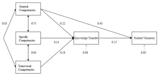 A path analysis was tested in which: (a) general, specific, and transversal competencies were interrelated; (b) these competencies were found to have effects on KT; and (c) both KT and general competencies showed effects on project rating. The model showed good overall data fit (Satorra–Bentler χ2 (2, N = 387) = 2.31, p = 0.315, CFI = 0.998, RMSEA = 0.02). All standardised residuals were very low (between −0.1 and 0.1) and all measurement equations were significant. The three competencies (i.e., general, specific, and transversal) were positively interrelated, with a stronger association between the general and specific competencies. The general competencies presented a positive effect on KT. Moreover, both general competencies and KT showed positive effects on the project rating. The model gave an explained variance of 22% for KT and 36% for project rating. Figure 1 presents the standardised coefficients of the effects.