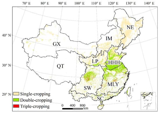 - Yan, H.M.; Xiao, X.M.; Huang, H.Q.; Liu, J.Y.; Chen, J.Q.; Bai, X.H. Multiple cropping intensity in China derived from agro-meteorological observations and MODIS data. Chin. Geogr. Sci. 2014, 24, 205–219. [Google Scholar] [CrossRef]
