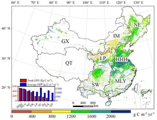 Spatial distribution of mean GPP in the cropland of China from 2000 to 2015. The insert map shows the average annual GPP and total GPP for each region.