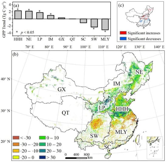 The trend of GPP across the whole country presented a markedly heterogeneous geographical pattern (Figure 3b). Overall, GPP increased in northern China, while the trend was the opposite in southern China. In particular, about 58.5% of the total cropland had a positive GPP trend, and approximately 23.9% experienced a significant increase (p < 0.05), of which 71.0% was distributed in NE, HHH, and LP. About 14.9% had a significant (p < 0.05) decrease in GPP, of which approximately 79.8% was located in the MLY, SW, and SC regions.
