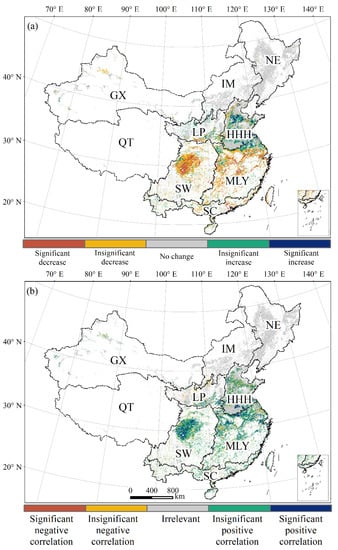 Spatial distribution of (a) trends in cropping intensity and (b) the correlation coefficients between cropping intensity and annual cropland GPP from 2000 to 2015.