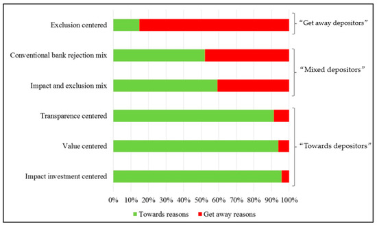 Five of the six clusters are characterised by one or two reasons, which were stated by each depositor of the cluster. Only the “Value centred” cluster shows a slightly wider distribution of reasons. However, since approximately 80% of depositors included stated “Shared values” as a reason for choosing a social bank, the cluster seems to be characterised sufficiently in this explorative context, even though some residuals might be included. An increase in the number of clusters led to the exclusion of these residuals, but to the creation of very small clusters. Figure 1 illustrates the proportions of “towards” and “get away” reasons among the six clusters. Three clusters predominantly consist of “towards” reasons and one cluster of “get away” reasons. The remaining two clusters show a strong mix of “towards” and “get away” reasons.