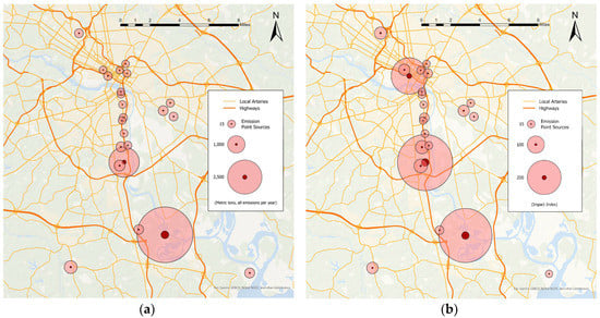Twenty-three largest air pollution point-source emitters in Richmond, Virginia. Symbol size of each facility is proportional to (a) total emissions and (b) derived “impact index,” estimating the relative impact on Richmond’s urban core. Dark orange lines represent highways, and lighter orange lines depict other major roadways. Data represent post-2017 records obtained from the Virginia Department of Environmental Quality (DEQ).
