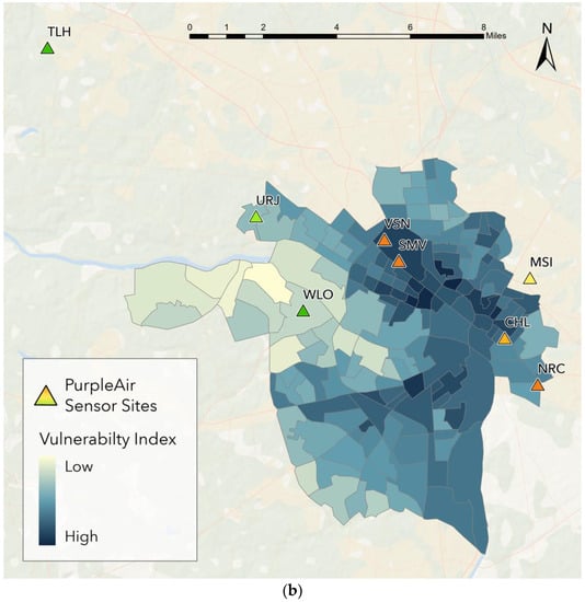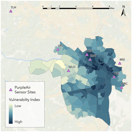 In total, eight sensors were installed throughout the city at locations representing a broad spectrum of socioeconomic and physical environments, including different types of land use, amounts of canopy cover, population densities, and racial and ethnic composition (Figure 2). To understand the spatial distribution of these variables, we incorporated findings from the city of Richmond [], which was published as an extension of the research conducted by Shandas et al. []. This includes comprehensive, high-resolution maps of UHI with socioeconomic and geographic variables overlaid by census block. A “vulnerability index” was also generated by this research, in which the aforementioned factors were aggregated to estimate the vulnerability of communities in each census block, referring to risks associated with health and socioeconomic outcomes. The index is a summation of percent poverty, percent canopy cover, percent impervious surface, and mean surface temperature increase throughout the day. These variables were chosen due to their substantial impact on environmental and socioeconomic wellbeing and the availability of data on the census block level. In mirroring this ongoing UHI research and building on previous studies [], we aim to draw the same comparisons with air quality and continue to monitor UHI as another covariable.