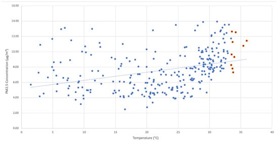 Daily ≤2.5 μm particulate matter (PM2.5) averages plotted against daily temperature (°C) averages from February 14 to November 14, 2019. The overall trend exhibited a weak positive correlation (R = 0.35). However, a distinct cluster of consistently high PM2.5 values occurred on the hottest days of the year (depicted in red), while cooler days exhibited highly scattered PM2.5 readings. The mean PM2.5 values were significantly higher (t(9) = 3.89; p < 0.01) on the ten hottest days (10.10 μg/m3) than for the total 2019 record (7.60 μg/m3).