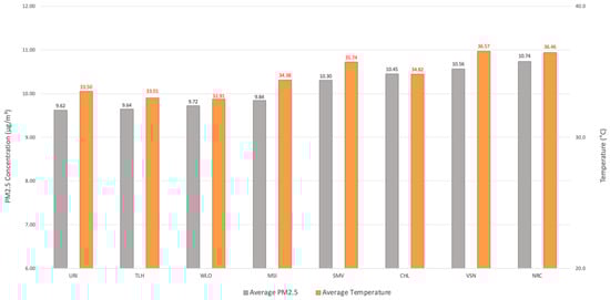 Statistically significant differences were observed for both temperature and PM2.5 among the eight sensors, with temperature displaying greater variability. Five significantly different temperature groups were recorded, while three groups were identified among PM2.5 values. In general, sites with lower PM2.5 also yielded lower temperatures, which followed a geographic pattern as well. Sites in the west end (URJ, TLH, and WLO) consistently yielded lower temperatures and PM2.5 values. Sites in the east end (NRC, MSI, and CHL) and those closer to the urban core (VSN and SMV) had higher PM2.5 and temperature readings, and the temperature-PM2.5 relationship was closely correlated but did not match exactly. These findings suggest the existence of a west–east trend, but it appears to level off east of the urban core, with the more vulnerable and lower-income communities in the east end experiencing poor environmental quality similar to the more intensely developed parts of the city. Conversely, the wealthier communities in the west end generally enjoy greater environmental amenities, including better air quality and fewer instances of extreme heat. These improved environmental conditions, combined with fewer socioeconomic- and health-related stressors, have been found to result in life expectancies of up to twenty years higher in these neighborhoods compared to their more vulnerable counterparts [].