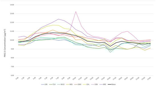 Hourly PM2.5 averages from each of the eight PurpleAir sensors aggregated into a 24-h diurnal cycle for the ten hottest days of 2019. PM2.5 levels peaked in the early morning and reached their minima in the mid-afternoon. The variability between sensors at any given time of day is also visible.