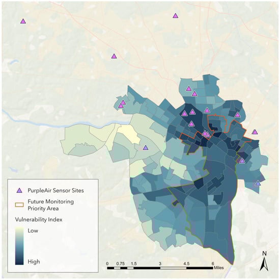 Future studies would also benefit from greater coverage and a higher spatial resolution network of sensors. In accordance with our understanding of how large emitters and vulnerable communities are spatially distributed throughout the city (Figure 1a and Figure 2), there are areas in need of monitoring that have not been reached. Relatively inexpensive sensors such as the PurpleAir PA-II provide the opportunity to expand the network economically, and plans are already in place through community partnerships to increase the number of stationary sensors in the region to 30–40 in total. However, important gaps remain in the network. Specifically, downtown and the south side of Richmond are the highest priority, as the south side has a significant industrial presence, and they both have heavy vehicle traffic and relatively high vulnerability (Figure 8). Future monitoring should ensure that predicted areas of high vulnerability to poor air quality are represented in sampling.