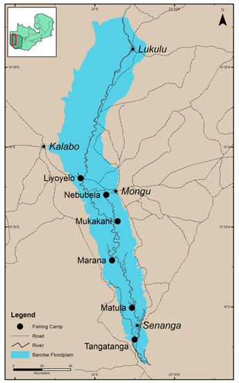 - Rajaratnam, S.; Cole, S.M.; Fox, K.M.; Dierksmeier, B.; Puskur, R.; Zulu, F.; Teoh, S.J.; Situmo, J. Social and Gender Analysis Report: Barotse Floodplain, Western Province, Zambia; CGIAR Research Program on Aquatic Agricultural Systems: Pulau Pinang, Malaysia, 2015. [Google Scholar]