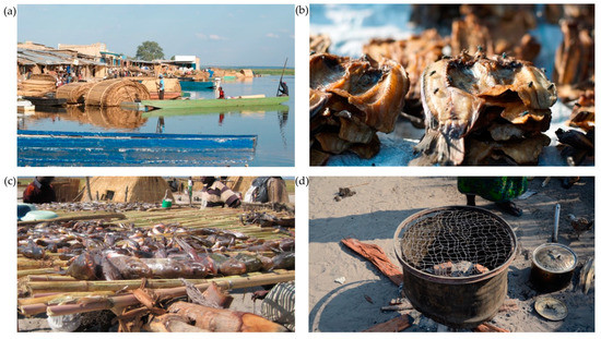 The descriptions of processing procedures, mostly recounted by women, indicate that processing fish demands a significant number of hours and care, especially if fish are larger and thus spoil easier, or take longer to process. This means that processors need to take care and ensure that the fish does not burn, which requires many hours of attention and work. Fish of all sizes are dried on elevated reed mats for around 12–24 h (see Figure 2c). Large catfish and tigerfish can take even longer to process. The reed racks are elevated to avoid being attacked by insects, rodents or dogs. Additionally, processors will need to swat away flies and chase away birds throughout the drying phase. These reasons explain why drying and smoking usually take place close to the homestead so that processors can complete other tasks, from gardening or cooking to caring for children, whilst also processing fish.