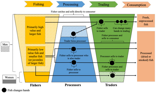 A fluid fish value chain from fishing camps to consumers. Note: The gender categories do not represent actual proportional differences in the nodes—they merely illustrate nodes that are primarily occupied by either women or men; nor do the arrowed lines necessarily go through the exact part of the nodes depicted as either female or male.