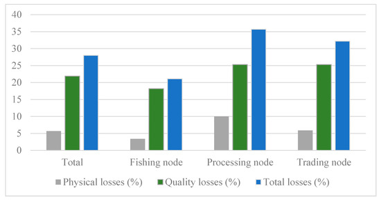 In total, 28.0% of the mass of fish recorded in the assessment was lost, 5.7% of which was absolutely discarded (physical loss), and 21.9% was sold at a lower price due to quality losses (Figure 4). A similar trend in losses was observed within each value chain node.