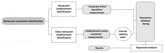 The first phase comprised identifying the restaurant corporations that should be included in the sample. In the second phase, online reputation was measured for the establishments belonging to each corporation in the final sample. For those that take the form of a restaurant chain (i.e., ownership of more than one establishment), an online reputation value needed to be estimated for the individual restaurants.