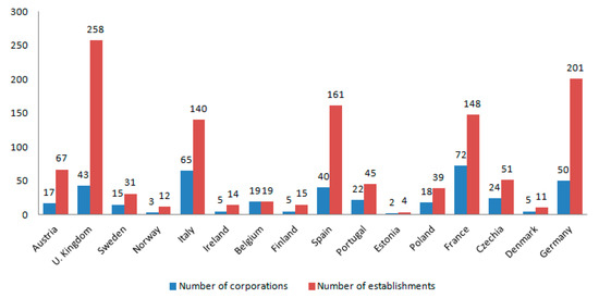France, Italy, Germany, the United Kingdom (UK), and Spain have the largest populations of active restaurant corporations, so, in the final sample, they also have the greatest weight. Each corporation’s number of establishments depends on the restaurant chains’ sizes in each country. In this sample, Germany, the UK, and Spain stand out as having a greater number of establishments due to their chains’ larger sizes.