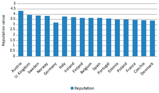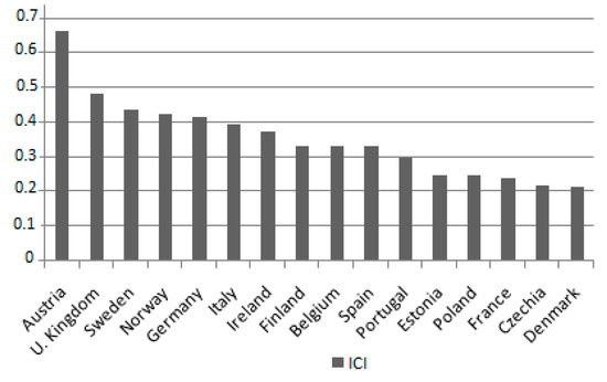 The simple aggregation of reputation values may thus not accurately capture the differences between countries due to the highly polarized values involved. The reputation intervals indicate this polarity exists for the selected countries, as, in some cases, the data present quite different minimum and maximum values. For example, France has a reputation value interval between 1.50 and 4.60 and Spain between 1.50 and 4.33. As explained previously, this problem of the aggregated reputation values’ reliability can be solved by using the ICI, whose values already offer a solution for a comparable situation regarding the restaurant reputation values by country. In the present results, the ICI varies between 0.67 for Austria and 0.22 for Czechia (i.e., the Czech Republic) and Denmark (see Figure 6).