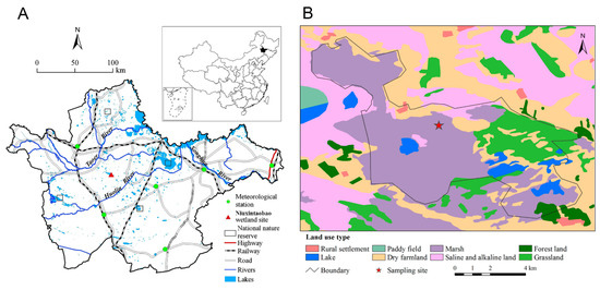 Map of the study site, (A) the location of Niuxintaobao Wetland in Songnen Plain (cited from [20], and (B) the sampling location in Niuxintaobao wetland in this study.