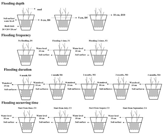 We set different flooding frequencies, depths, durations, and occurrence times in separate pot experiments, as follows (Figure 2). (1) We set three flooding depth levels for the whole growing season: 0 cm, 5 cm, and 10 cm (D0, D5, D10), while the flooding duration, flooding frequency, and flooding occurrence time remained t10 cm. (2) We set three flooding frequencies during four months: No flooding, flooding one time, flooding two times (F0, F1, F2), respectively, which indicated flooding for 0 time; flooding 1 time for the whole season and flooding duration with 2 months; flooding 2 times, and each time set flooding and drainage for 1 month, respectively, and total duration of flooding was 2 months. (3) Five flooding durations were set: 0 months, 1 month, 2 months, 3 months, and 4 months (M0, M1, M2, M3, M4), respectively. (4) Four flooding occurrence times were set: Flooding for one month starting from June, July, August, and September, (C1, C2, C3, C4), respectively. The experimental period lasted from May until 1 October. Except for the flooding treatments with different depths, drought was avoided by keeping the water content at 35–40% of the field capacity using a syringe (weight-based method). All pots were kept in a greenhouse to avoid disturbance by rainwater. The greenhouse was ventilated to keep a similar temperature inside to that outside. Three replicates were tested for each treatment, with a total of 36 pots.