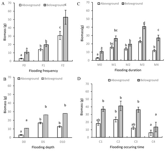 Effects of flooding frequency (A), depth (B), duration (C), and occurrence time (D) on biomass of P. australis (per pot). Note: Different letters in the same columns indicate significant differences (p < 0.05).