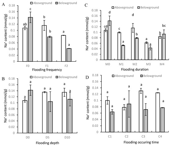 Effects of flooding frequency (A), depth (B), duration (C), and occurrence time (D) on Na+ contents of P. australis. Note: Different letters in the same columns indicate significant differences (p < 0.05).