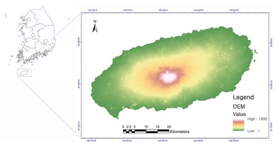Jeju Island is the largest island on the Korean Peninsula. It is a volcanic island with an area of 1848 km2 (Figure 1). It was declared a UNESCO Biosphere Reserve in 2002, a World Natural Heritage site in 2007, and a Geological Park in 2010 [32]. From Halla Mountain (1939 m above sea level) at the center of the island to the coastal areas (0 m above sea level), the altitude gradually decreases; this region serves as a habitat for various species depending on the altitude. As such, Jeju Island is an area with high environmental and ecological protection value.