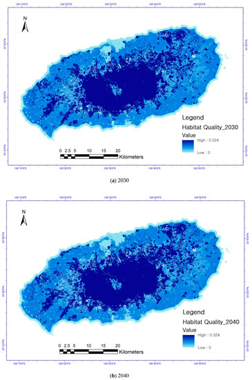Long-term green infrastructure management will be possible if land-use management measures, such as designating protected areas or expanding green spaces, are implemented based on predicted changes in the habitat quality, which was the aim of this study.