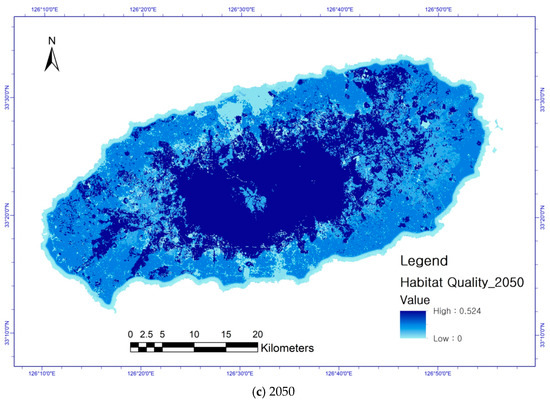 Jeju deer habitat quality map for (a) 2030, (b) 2040, and (c) 2050.