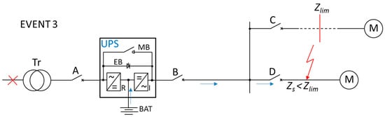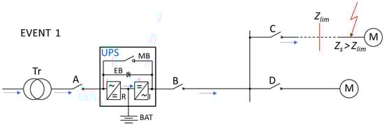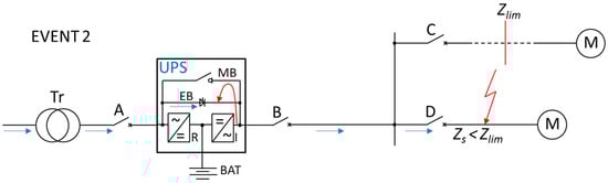 Two lines of different length (impedance) fed by uninterruptible power supply (UPS) working in double conversion mode. Zs—short-circuit loop impedance, Zlim—limit loop impedance, Tr—transformer, A, B, C, D—protective device, MB—maintenance bypass path (also referred to as manual bypass path), EB—electronic bypass path, R—rectifier, I—inverter, BAT—battery. EVENT 1 without the effect of switching to EB line during distant short-circuit (Zs > Zlim).