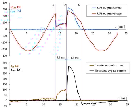 Voltage and current waveforms at 30 kVA UPS output during near phase—ground (L-PE) short-circuit, switched off by overcurrent protective device D (visible in Figure 2). a—short circuit start, b—the moment of switching from the inverter to EB line, c—short circuit stop.