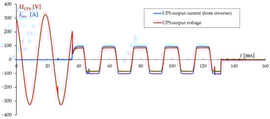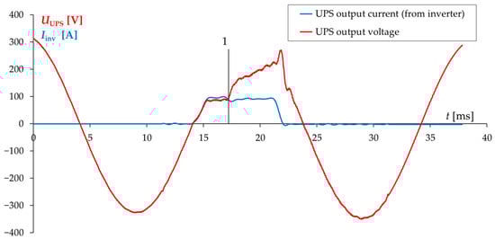 The phenomenon of switching from the inverter to EB during a short-circuit at UPS output is typical behavior for online construction and occurs when the UPS overload capacity is exceeded, usually above 150% of the UPS nominal current [3,13,14]. The time of switchover from the inverter to EB is about 3–5 ms (typical time for most of UPSs of different manufacturers). Sample of voltage and current waveforms recorded at UPS output during a near short-circuit for EVENT 2 are shown in Figure 3.