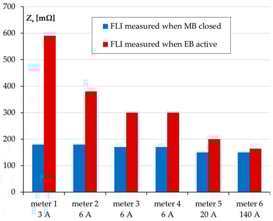 During the test, the instruments 1 to 6 forced, respectively, the following test currents: 2, 6, 6, 6, 20, and 140 A. The measurement was carried out with no load at UPS output. Under real conditions, when the UPS is being commissioned, FLI measurements in UPS-powered circuits are often performed without any load. In such conditions, it was found that the measured FLI results were significantly higher for the UPS set in active EB mode when the used instruments forced currents at the level of several amps. For the closed MB switch, the results of FLI measurements carried out with instruments 1–6 differed by a maximum of 15%, while for the active EB by almost 400%. FLI measurement performed with meter 6, which forced 140 A test current, allowed the analyzed UPS to get the result closest to the real value of ZEB impedance in the short-circuit condition. Increasing the load at UPS output resulted in a decrease of the difference between FLI values measured using different instruments and their approach to the value measured by meter 6. The difference in FLI measurements performed with meter 6 for MB closed and EB active was relatively small and indicated the presence of additional impedance of around 15 mΩ in the EB path. Both results, shown for MB closed and EB active by meter 6, were very close to real values.
