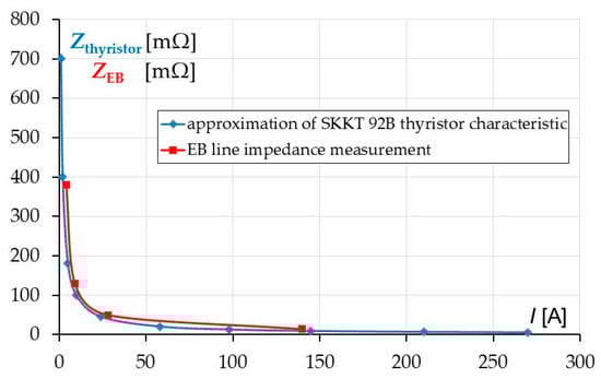 Figure 9 shows the measured impedance EB, whose main component is the thyristor impedance Zthyristor, as a function of load current. The other characteristic Zthyristor = f(I) was plotted by approximating the manufacturer’s characteristic It = f(Ut) for SKKT 92B thyristor, installed in the tested 30 kVA UPS.
