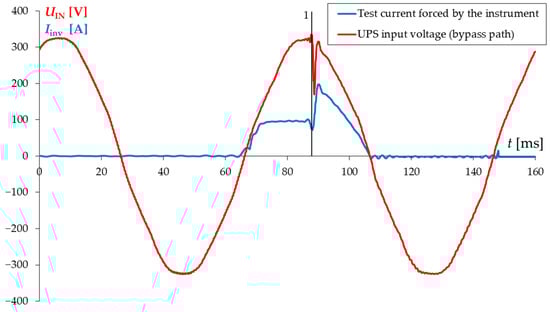 The results of FLI measurements carried out with different instruments in UPS battery operation mode differed from each other more than 10 times. Some of them indicated the impedance close to 0 Ω (e.g., 30 mΩ), which could lead to the conclusion that the expected short circuit current could be over 7 kA, while the real current measured at UPS output during the short-circuit test was Iinvmax1 = 98 A. The impedance calculation algorithm used by various instruments is based on the forced current and voltage measurement, with particular emphasis on voltage drop during test current forcing [9,10,18]. The UPS inverter, loaded with the instrument test current, controls the switching of IGBT transistors to stabilize the output voltage with the highest accuracy (typically 1%, with the response time of single milliseconds). In these conditions, the instrument voltage measurement is disturbed and the expected current values are much higher than those measured at the same point, but for the UPS with MB switch closed. The tests confirmed that the current limited by the UPS inverter during the short-circuit at UPS output is much smaller than the current during the same test with MB switch closed when the mains voltage is present.