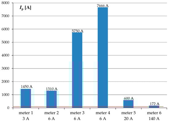 The expected fault currents, calculated from FLI measured values, by six instruments used in the test, are presented in Figure 11 (UPS was working in battery mode, no mains voltage present).