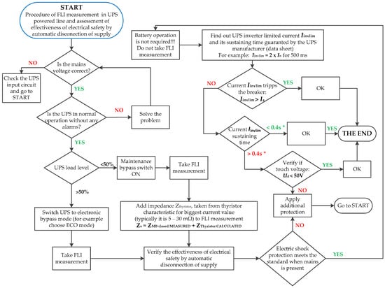 Algorithm of FLI determination in circuits fed by UPS and assessment of the effectiveness of electrical safety by automatic disconnection of supply. Iinvlim—inverter limited current during short-circuit in the UPS output with no mains available (Iinvlim available in UPS manufacturer’s document); Ia—current demand to switch the supply off in required time, according to standard [6]; UPS normal operation—UPS in double conversion mode AC-DC-AC. * according to Table 41.1 of standard [6], max. disconnection times for 230 VAC in circuits with a rated current not exceeding: a. 63 A with one or more socket outlets, or b. 32 A supplying only fixed connected current-using equipment.