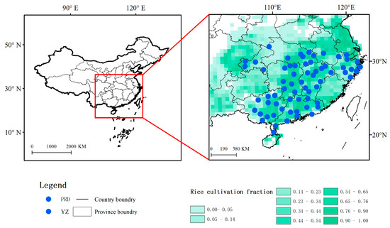 The study area included two major early-mature rice production regions in China, of which one is in the middle and lower reaches of the Yangtze River (YZ) and the other is in the Pearl River Delta (PRD). The YZ region contains Anhui, Jiangxi, Zhejiang, Hubei, and Hunan provinces (49 sites), and the PRD region contains the Guangdong and Guangxi provinces (26 sites; Figure 1). These agro-meteorological experimental stations are maintained by professional agricultural technicians following standardized observation criteria and strictly prescribed procedures under the control of the Chinese Meteorological Administration (CMA) [52].