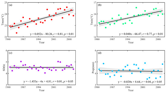 Trends of daily maximum temperature (Tmax), daily minimum temperature (Tmin), sunshine duration (SD), and precipitation (Prep) across all sites during the study period 1981–2010. Note: (a–d) represents Tmax, Tmin, SD, and Prep, respectively.