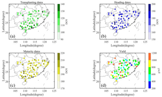 The average dates of the phenological variables (transplanting, heading, and maturity dates) and yields of early mature rice at each site during the study period were obtained (Figure 3). The average transplanting date was 114.94, 110.19, and 123.63 day of year (DOY) for all sites, YZ, and PRD, respectively. Similarly, the average heading date was 175.38, 172.94, and 181.26 DOY for all sites, YZ, and PRD, respectively, with the average maturity date being 197.89, 193.74, and 205.20 DOY, respectively. It can be concluded that the phenological variables of all sites in PRD were commonly later than those in YZ. The average value of yields was 910.59, 806.78, and 580.61 g/m3 for all sites, YZ, and PRD, respectively. The average yield at sites in YZ was generally higher than those in PRD.