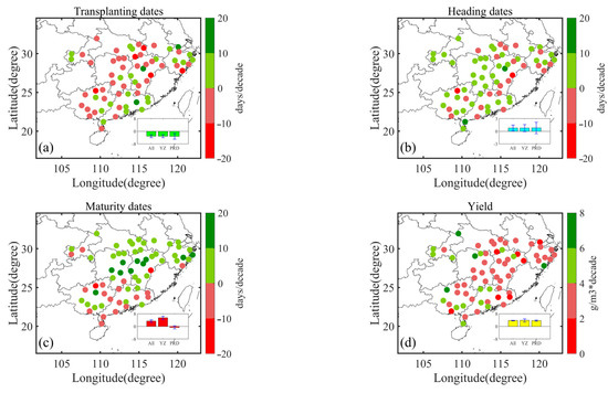 Using LRM, the trends of phenological variables and yields of all sites during the study period were calculated (Figure 4). The average trends of transplanting dates for all sites, YZ, and PRD were −3.18, −3.11, and −3.15 days/decade, respectively. The average trend of heading dates for all sites, YZ, and PRD were 0.58, 0.76, and 0.78 days/decade, respectively. The average trend of maturity dates for all sites, YZ, and PRD, were 2.47, 5.39, and −0.63 days/decade, respectively. The average trends of yields for all sites, YZ, and PRD were 4.55, 3.90, and 9.65 g/m3 per/decade, respectively. The spatial results in Figure 4 indicate that transplanting dates at most sites had advanced, while all heading dates and maturity dates were delayed over the study period.