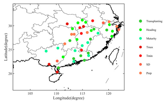 Since the impacts of three phenological variables (transplanting, heading, and maturity dates) and four climatic variables (Tmax, Tmin, SD, and Prep) were relatively large, these seven variables were selected to confirm the main influencing factors using the method introduced in the Methods section. The detailed results are shown in Figure 5, in which the dominating phenological (climatic) variables are shown in green (red) to show the different main influencing factors, respectively. Since there had been misalignments of the phenological variables, climatic variables, and yields, only 44 sites were chosen for the final results in this analysis. The phenological variables painted with green are the dominating influencing factors compared with climatic variables painted with red, which correlate with the yields of early mature rice. Thus, the phenological variables (transplanting, heading, and maturity dates) played important roles in influencing rice yields at most sites in China during the study period. When undertaking a deeper investigation, sites in PRD were found to be most impacted by phenological variables, while sites in YZ were impacted by both phenological and climatic variables.