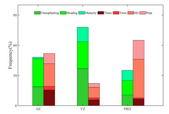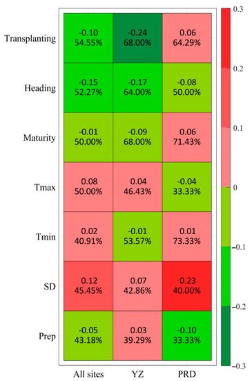 The average partial correlation coefficients between phenological variables, climatic variables, and yields were calculated (Figure 6). For all sites, the calculated coefficients of transplanting, heading, and maturity dates were −0.10, −0.15, and −0.01, respectively. The transplanting date had advanced at most sites, and the negative relationship may indicate that the transplanting date would have increased rice production. Meanwhile, the delayed phenological variables of heading and maturity dates and their negative relationships imply that they would have reduced rice production. In contrast, the average coefficients of Tmax, Tmin, SD, and Prep were 0.08, 0.02, 0.12, and −0.05, respectively, which implied that most climatic variables positively influenced rice yields and increased rice production. The average value of the coefficients was different for the two regions, and the phenological variables were all negative for YZ; the heading date was the only factor that was negatively correlated with yields for PRD. Thus, the influencing mechanisms of phenological variables on rice yield appear to be different for YZ and PRD. The influencing mechanisms of climatic variables on rice yield were also different, and the impacts of Tmax, SD, and Prep were all positive to rice yields, while Tmin was in a negative relationship with rice yields. Tmax was in a positive relationship with rice yields, perhaps because Tmax had not reached the highest temperature threshold for rice growth and development. SD and Prep promoted rice production, while Tmin may have reduced the yield of early mature rice by putting stress on sites in YZ. Tmin and SD were both in positive relationships with rice yields in PRD, indicating they had increased rice yields, while the negative Tmax may indicate the yield here was affected by stress from high temperatures and lack of water. In total, the phenological indicators played important roles, which were even greater than those of climatic variables, in affecting rice yields.