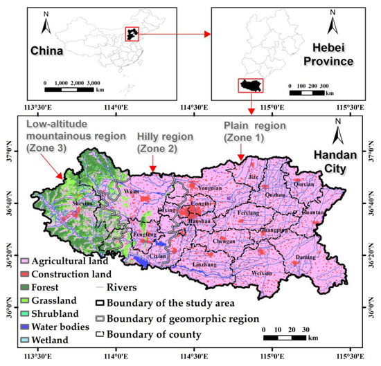 The reasons for choosing Handan as the study area are as follows. First, Handan belongs to a traditional agricultural area and has distinct advantages in cultivating wheat, corn, and cotton. According to the “Hebei Economic Yearbook (2018)”, its grain output ranked second among 11 prefecture-level cities in Hebei Province and 22nd among all prefecture-level cities in China. Second, Handan is a representative city where the protection of agricultural land is facing pressure from the population growth, water shortage, and urban sprawl. Just like many cities in the world, Handan has undergone a significant reduction in agricultural land and rapid rise of construction land in recent years, threatening local food security and sustainable agricultural development. According to the land use maps of Handan in 2010 and 2020, the proportion of agricultural land declined from 73.6% to 66.8%. Correspondingly, the proportion of construction land increased from 10.9% to 16.9% and the proportion of ecological land increased from 15.5% to 16.3%. Third, Handan is a typical area where various landforms have led to obvious regional differences in land use. In 2015, the proportion of agricultural land in Zone 1, Zone 2, and Zone 3 was 85%, 75%, and 34%, respectively. Accordingly, this study is expected to provide effective guidance for assessing and improving agricultural land suitability under different geomorphic conditions.