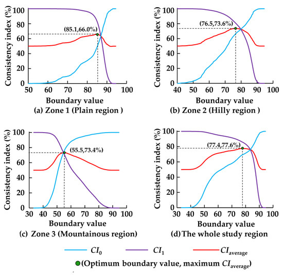 The consistency indexes were used to identify the optimum boundary value of the suitable category and unsuitable category in each sub-region of Handan. As the boundary value increased from 30 to 100, more and more evaluation units were classified as unsuitable for agriculture. Correspondingly, the consistency index of non-agricultural land (CI0) increased from 0% to 100%, whereas the consistency index of agricultural land (CI1) decreased from 100% to 0% and the average consistency index (CIaverage) increased at first and then decreased (see Figure 2). When CIaverage reached the maximum, both CI0 and CI1 were at a relatively high level. In this case, the corresponding boundary value distinguishing between the suitable category and unsuitable category was regarded as the optimum choice. Considering the regional differences, the optimum boundary values in Zone 1, Zone 2, and Zone 3 were 85.1, 76.5, and 55.5, respectively.