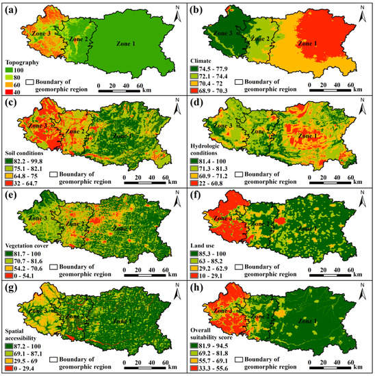 The suitability score maps of evaluation factors and the overall suitability score map in Handan. (a) Topography; (b) Climate; (c) Soil condition; (d) Hydrologic condition; (e) Vegetation cover; (f) Land use; (g) Spatial accessibility; (h) Overall suitability score.
