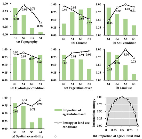 The proportion of current agricultural land and information entropy of land use corresponding to different suitability grades of evaluation factors. (a) Topography; (b) Climate; (c) Soil condition; (d) Hydrologic condition; (e) Vegetation cover; (f) Land use; (g) Spatial accessibility; (h) The information entropy of land use corresponding to the proportion of agricultural land.
