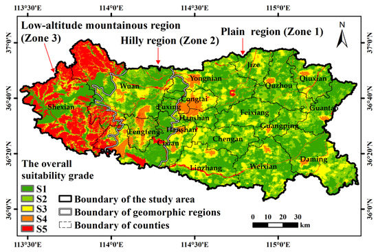 Classification of overall suitability score in the three geomorphic regions of Handan.