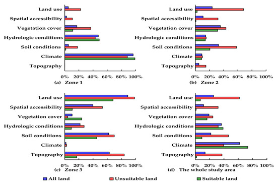 According to Figure 6, the main limiting factors were different in the three geomorphic regions of Handan. Climate, hydrologic condition, and vegetation cover were the main limiting factors of both suitable land and unsuitable land in Zone 1. The land use, spatial accessibility, vegetation coverage, and soil conditions placed more restrictions on the unsuitable land in Zone 1. Vegetation cover, soil condition, and land use were the primary restraints in Zone 2. The suitable land was mainly limited by vegetation cover, soil condition, and hydrologic condition. Land use, spatial accessibility, and topography imposed more limitations on the unsuitable land in Zone 2. Land use, topography, soil condition, and spatial accessibility were major limiting factors in Zone 3. Spatial accessibility and topography were merely the main constraints of unsuitable land. The suitable land was mainly restricted by land use, soil condition, and vegetation cover.